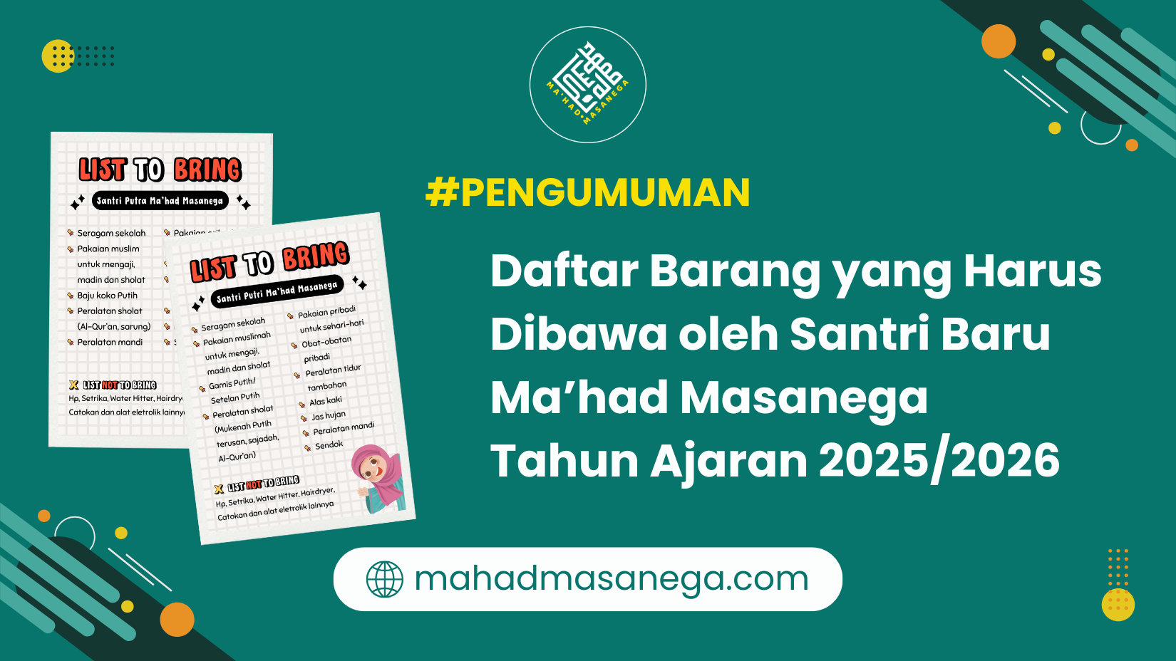 Diberitahukan kepada seluruh santri baru Ma’had Masanega, agar memperhatikan dengan seksama daftar barang yang wajib dibawa saat kedatangan ke Ma’had. Tujuannya adalah untuk menunjang kegiatan pembelajaran, ibadah, dan kebutuhan harian selama tinggal di lingkungan Ma’had.