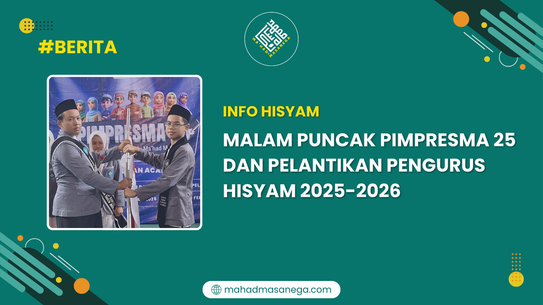 Masanega, 23 Februari 2025 – Malam puncak PIMPRESMA 2025 dan Pelantikan Pengurus HISYAM masa khidmah 2025-2026 berlangsung khidmat di Masjid Masanega, mulai pukul 20.10 WIB. Acara diawali dengan pembacaan Surat Keputusan oleh Ustadz Multazam, S.Pd., dilanjutkan pelantikan yang dipimpin langsung oleh Mudir Ma’had Masanega, Ustadz Drs. H. Nurkholis.