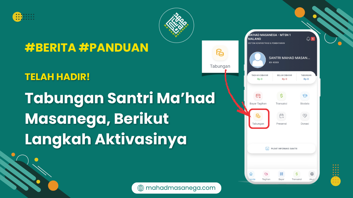 Alhamdulillah, Ma’had Masanega terus berinovasi: kini hadir fasilitas Tabungan Santri yang terintegrasi langsung dengan aplikasi pembayaran Ma’had Masanega. Dengan fitur ini, santri belajar mengatur keuangan secara mandiri sementara orang tua/wali tetap mendapatkan kontrol dan transparansi penuh melalui aplikasi.